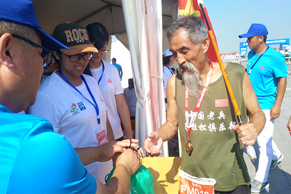 9月1日下午,志愿者开展赛前实战演练。青年志愿者身着整齐的运动服,不顾高温日晒,接受2017盘锦红海滩马拉松赛的医疗志愿者、裁判志愿者以及安保志愿者的业务培训。
