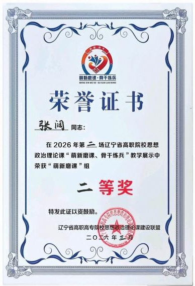 近日,2026年第二场辽宁省高职高专院校思想政治理论课“萌新磨课、骨干练兵”教学展示决赛圆满落幕。我校思政教研部教师张阔、韩冬冬凭借扎实的专业功底与精巧的教学设计,分别斩获“萌新磨课”组二等奖、“骨干练兵”组二等奖,为学校赢得荣誉。
