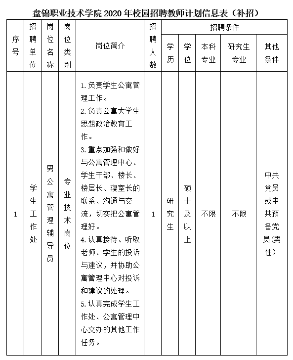 一、《盘锦职业技术学院2020年校园招聘教师计划信息表》中,补招男公寓管理辅导员1人,具体要求如下: