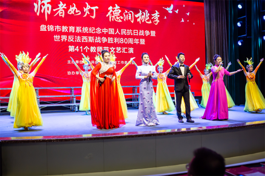 2025年9月10日,由中共盘锦市委教育工作委员会、盘锦市教育局主办的“师者如灯 德润桃李”——盘锦市教育系统纪念中国人民抗日战争暨世界反法西斯战争胜利八十周年暨第41个教师节文艺汇演,在盘锦市高级中学隆重举行。全市教育工作者齐聚一堂,共庆佳节,我校共有四名教师与十六名学生登台参演,学校党委副书记、校长宋锦出席本次活动。