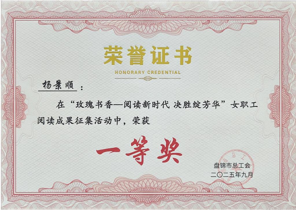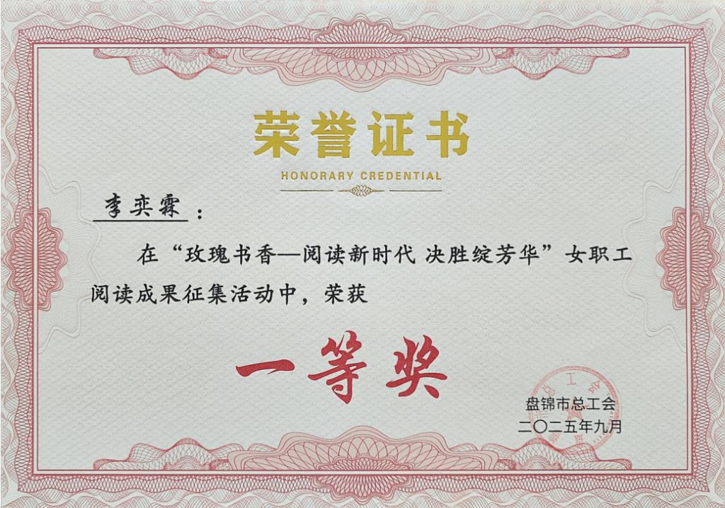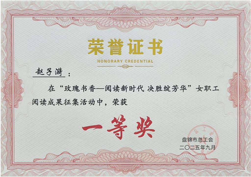 近日,由盘锦市总工会主办的“玫瑰书香·阅读新时代 决胜绽芳华”全市女职工阅读成果评选结果揭晓,我校李奕霖、赵子漪、杨景顺三位教师的作品《祖国到底是什么》在全市众多参赛作品中脱颖而出,荣获佳绩。